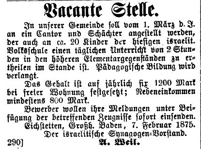 Stellenausschreibung aus der Zeitschrift „Der Israelit“ vom 10.2.1875