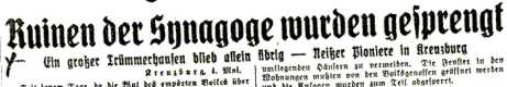 ... Mit Windeseile sprach es sich gestern vormittag herum, daß die Ruinen der Synagoge und der Halle auf dem Judenfriedhof gesprengt werden würden. Eine Abteilung der Neisser Pioniere ... war dazu ... nach Kreuzburg gekommen, um die Sprengung vorzunehmen. ... Zu den Sprengungen hatten sich natürlich viele Volksgenossen eingefunden, die mit großem Interesse die Arbeiten der Pioniere verfolgten und sich sichtlich darüber freuten, daß endlich die Ruinen beseitigt wurden und damit der Rest eines Gebäudes verschwindet, das nie in das Stadtbild gepaßt und fremdrassigen Menschen diente, die einst mit die Zersetzung des Volkes betrieben haben. Wie wir erfahren, wird nun sofort mit den Aufräumungsarbeiten begonnen werden, ... Hoffentlich geht auch das schnell vonstatten, damit aus dem Trümmerfeld bald eine neue Grünanlage erstehen kann, die der Stadt zur Zierde gereichen wird.