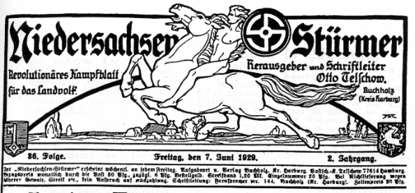 Juda in Lüneburg     ... Juda feiert in Lüneburg geradezu Triumphe. Das Spießerstädtchen mit seiner großen bürgerlichen Vergangenheit im Mittelalter steht heute unter dem Einfluß des Marxismus, der Juden und Freimaurer. ... Daher scheint es auch nicht sehr verwunderlich, wenn die kleine jüdische Gemeinde in Lüneburg ... sich sehr gewichtig zu machen weiß.   Wir berichteten bereits, daß der Regierungspräsident von allen Rechtsanwälten Lüneburgs nur den Juden und Genossen Dr.Strauß für würdig befand, die Prozesse der Regierung zu führen. Man sicherte dadurch dem “Genossen und Juden” einen nicht unerheblichen sicheren Verdienst zu. ...   Heute geht uns die Nachricht zu, daß von den vielen Aerzten in Lüneburg Stadt und Land ausgerechnet eine Jüdin Heinemann für würdig befunden wurde, als Kreisschulärztin die Gesundheit unserer Bauernbuben und -mädel im Landkreis Lüneburg zu überwachen ! Wie talentvoll sind doch unsre Lait ! ... Sie nehmen eine Jüdin als Aerztin ihrer Kinder ohne Widerspruch hin ! Schlaft nur weiter ! Euer Erwachen wird einst um so grauenvoller sein !