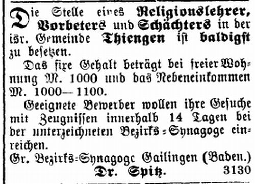 Stellenangebote des Bezirksrabbinats für eine Lehrerstelle in Tiengen von 1879 und 1889