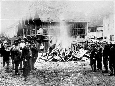 Zerstörte Inneneinrichtung und Verbrennung des Synagogeninventars, 10. Nov. 1938 (Aufn. Hauptstaatsarchiv Stuttgart)