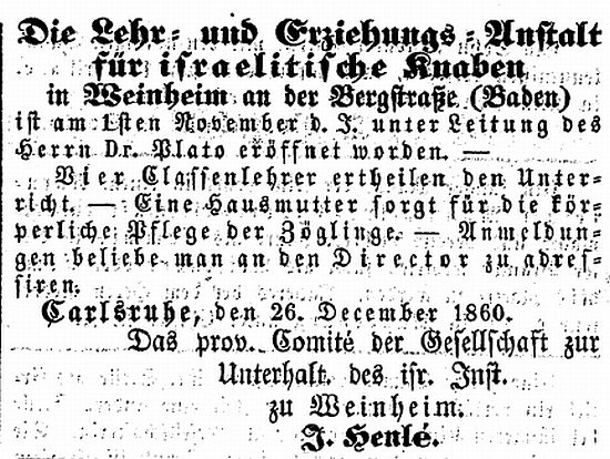 Für die Dauer von drei Jahren existierte in Weinheim eine „Lehr- und Erziehungsanstalt für israelitische Knaben“, die 1863 nach Karlsruhe verlegt wurde.