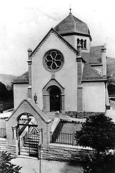 Die alte Synagoge aus dem Jahre 1690 musste 1812 vorübergehend geschlossen werden; da die kleine jüdische Gemeinde eine Renovierung bzw. einen Neubau nicht realisieren konnte, fanden Gottesdienste jahrzehntelang in einem Behelfsraum in der Hauptstraße statt. Gegen Mitte des 19.Jahrhunderts war die im Wachsen begriffene Gemeinde wirtschaftlich in der Lage, das alte Synagogengebäude renovieren und vergrößern zu lassen. Mit finanzieller Unterstützung des jüdischen Lederfabrikanten Sigmund Hirsch wurde 1905 in der (Bürgermeister-) Ehret-Straße ein neues Synagogengebäude errichtet, das im großen Stile 1906 eingeweiht wurde; als Architekt des Baues zeichnete Max Seckbach verantwortlich. Über die Synagogeneinweihung berichtete die „Allgemeine Zeitung des Judentums“ in ihrer Ausgabe am 24.Aug. 1906: