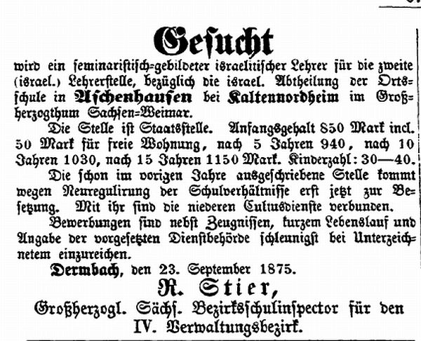 In einer Stellenanzeige der "Allgemeinen Zeitung des Judentums" vom 5. Okt. 1875 wurde für die „jüdische Abteilung“ der Ortsschule ein Lehrer gesucht: