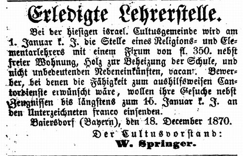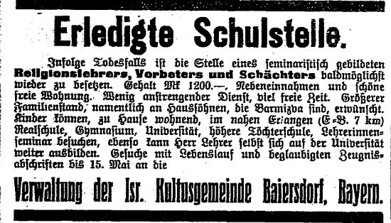 Nach Auflösung des Rabbinats (1888) erledigten die jüdischen Lehrer die meisten kultischen Aufgaben der Gemeinde; die letzte Ausschreibung einer Lehrerstelle in Baiersdorf geschah im Jahre 1914 (siehe Anzeige unten).