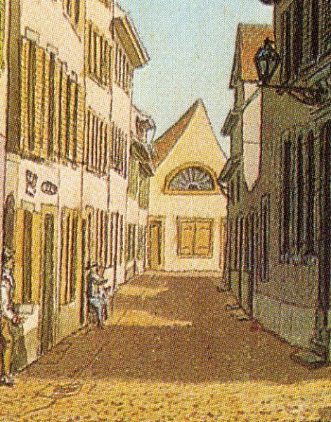 Bethaus am Unteren Heuberg - Gemälde von Johann Jakob Schneider 1848 und Bildausschnitt (aus: wikipedia.org, CC BY-SA 4.0 und alemannia-judaica.de)