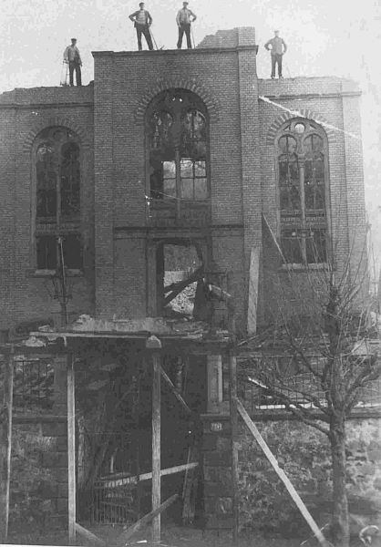 Heute früh brannte in der 7.Morgenstunde die hiesige Synagoge vollständig aus. Bereits nach 5 Uhr will man den Brandgeruch bemerkt haben, ohne aber festzustellen, ob und wo es brenne. Als gegen 6.30 Uhr die Feuersirene ertönte, zeigte mächtiger Rauch den Brandherd an. In kurzer Zeit war der Innenraum des Hauses ein einziges gewaltiges Feuerwerk. An eine Rettung des Gebäudes war nicht mehr zu denken. Man beschränkte sich auf den Schutz der Nachbargebäude. Haushoch schlugen die Flammen aus dem Dach des Gebäudes. Und nach kurzer Zeit brachen die Dachsparren zusammen. Mit dem Abflauen des Brandes trat das Ablöschen und Sichern ein; die Feuerwehr war ständig tätig, eine weitere Ausdehnung des Brandes abzuhalten.