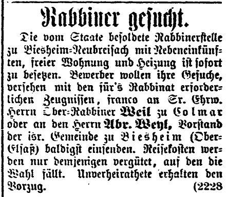 Synagoge von Biesheim (hist. Aufn., Sammlung J. Hahn) - Anzeige aus: „Frankfurter Israelitisches Familienblatt" vom 27.4.1885
