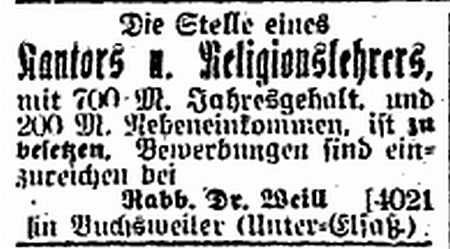 "Buchsweiler (Unter-Elsass), 9. Juli. Sonntag, 6. d. fand hier eine Feier statt, die jeden wahren Jehudi mit Stolz und Freude erfüllen muß. Unser neuer Rabbiner, Herr Dr. Adolf Singer, bisher Rabbiner in Niedersept, wurde am genannten Tage feierlich in sein Amt eingeführt. Um 3 Uhr Nachmittags versammelten sich die Mitglieder der hiesigen isr. Gemeinde, alle festtäglich gekleidet, in unserer herrlich geschmückten und beleuchteten Synagoge. Als Gäste waren erschienen: Das Stadtverordneten-Kollegium mit dem Herrn Bürgermeister an der Spitze, der Herr Pastor der hiesigen evang. Gemeinde, der Herr Director des hiesigen Gymnasiums, der Herr Amtsrichter und noch viele andere Honoratioren der hiesigen Stadt, endlich die Herren Cultusvorsteher der zum hiesigen Rabbinatsbezirke gehörigen Gemeinden.