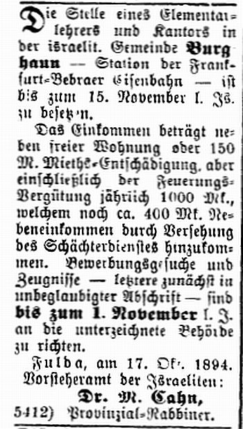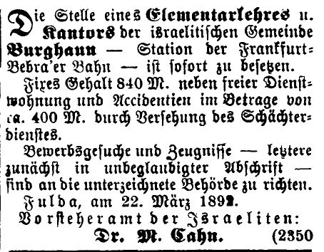 Mehr als vier Jahrzehnte (1850 bis 1892) übte Hermann Strauß „das aufopferungsvolle Amt eines Elementar- und Religionslehrers und Kantors in der hiesigen zum Rabbinatsbezirke Fulda gehörigen Gemeinde“ aus.