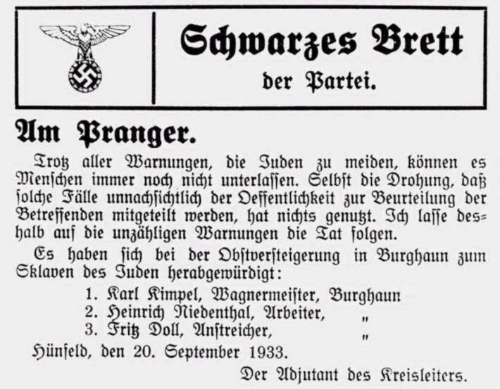 Schon vor dem 1.April 1933 kam es in Burghaun zu ersten Beschädigungen jüdischen Eigentums, als im Anschluss an einen Fackelzug zu Ehren des „Tages von Potsdam“ die Fensterscheiben jüdischer Häuser eingeworfen wurden. Auch noch Tage danach waren Übergriffe zu verzeichnen. Aus der "Fuldaer Zeitung" vom 26.3.1933: "Ausschreitungen in Burghaun ... In der Nacht von Dienstag auf Mittwoch wurden fast sämtlichen jüdischen Einwohnern die Fenster und Schaufenster sowie teilweise auch die Türfüllungen zertrümmert. Die Ermittlungen nach den Tätern sind noch im Gange. Wie wir hören, sollen jetzt jede Nacht Wachen aufgestellt werden, um ähnliche Vorkommnisse zu verhüten." Zum Boykott der jüdischen Geschäfte Burghauns hatte der NSDAP-Kreisleiter J.Kirchner aufgerufen. Geschäfte und Warenlager wurden demoliert, jüdische Bewohner überfallen und geschlagen. Im Spätsommer 1936 kam es erneut zu Sachbeschädigungen jüdischen Eigentums; zwei Jahre später existierten dann nur noch drei jüdische Gewerbebetriebe. Die als Sprachrohr der NSDAP fungierende Tageszeitung „Fuldaer Nachrichten” war bereits sehr früh für ihre antisemitische Verhetzung und die Einschüchterung der „arischen“ Bevölkerung bekannt, wie die folgende Meldung zeigt:
