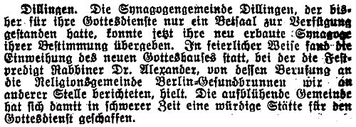 Mit dem heutigen Passahfest feiert der 1.Vorstand der hiesigen Synagogengemeinde, Herr Kaufmann Adolf Hoffmann zu Dillingen, sein 25.Jubiläuem als Gründer und Vorsitzender der Gemeinde. Herr Hoffmann hat in dem Vierteljahrhundert seiner Tätigkeit stets seine ganze Kraft für das Gedeihen des Werkes eingesetzt und keine Mühe gescheut, den Zusammenschluß lebensfähig zu halten und darüber hinaus zu kräftiger Blüte zu führen. Nicht zuletzt ist es seiner aufopfernden Tätigkeit gelungen, der Gemeinde ein eigenes Gotteshaus in einfachem aber stimmungsvollem Rahmen zu schaffen ... Die hiesige Gemeinde läßt den Tag nicht ohne entsprechende Ehrung vorübergehen. ... Auch wir wünschen dem Jubilar, der im Laufe der Jahre ein geachteter und allseits beliebter Bürger unserer Gemeinde geworden ist, zu diesem Ehrentag besonders Glück.