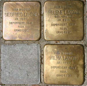 „Stolpersteine“ für Familie Kann in der Duisburger Straße und Familie Landau in der Hedwigstraße (Aufn. aus: stolpersteine-dinslaken.de)