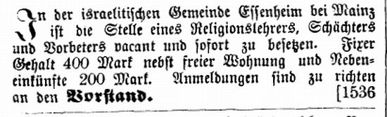 In unserm Orte fand heute eine ebenso seltene wie erhebende Feier statt. Die hiesige isr. Gemeinde, welche bisher ihre Todten in der Nähe des drei Stunden von hier gelegenen Ortes Jugenheim begrub, hatte von der Ortsgemeinde einen Platz zur Errichtung eines eigenen Friedhofs zum Geschenk erhalten. Heute wurde die erste Leiche auf diesem Friedhofe beerdigt und bei dieser Gelegenheit das neue Todtenfeld unter Betheiligung sämmtlicher hiesiger Israeliten und einer großen Anzahl christlicher Bewohner - unter ihnen die Geistlichkeit, der Magistrat und die übrigen Behörden - eingeweiht. Herr Rabbiner Dr. Lehmann aus Mainz hielt die Weiherede. In begeisterter Weise hob der Redner hervor, wie die Nacht des Mittelalters gewichen und der frühere Haß der Religionen und Confessionen gegeneinander immer mehr verschwunden sei. Die religiöse Duldung sämmtlicher Bewohner von Essenheim lege von diesem schönen Zuge der Zeit ein nachahmenswerter Zeugniß ab. ...
