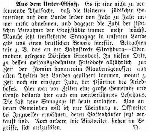 Geliebte Brüder!Unter den aus dem Mittelalter stammenden ehrwürdigen Denkmälern des isr. Elsaß, die unsererseits eine achtungsvolle Sympathie verdienen, und deren Erhaltung uns theuer sein sollte, befindet sich unstreitig der Begräbnißplatz zu Ettendorf. Dieses heilige Stück Land mit seinen oft mehrere hundert Jahren alten Steinen, die uns an die finstern Zeiten erinnern, in der die über die Erde zerstreuten Israeliten aus der Gesellschaft gestoßen, der Luft und des Raumes beraubt, nur da leben und sterben konnten, wo die Intoleranz der damaligen Gesellschaft es ihnen erlaubt, hat ehemals fast allen isr. Gemeinden des Unter-Elsaß zum Ruheplatz gedient und ist noch jetzt für 24 Gemeinden dieser Gegend, die hier ihre Todten bestatten, ein gemeinsamer Friedhof. Hier finden sich die irdischen Ueberreste vieler berühmten Rabbinen und anderer durch ihr Wissen und ihre Frömmigkeit ausgezeichneter Glaubensgenossen, deren Gräber uns theuer sein und durch unsere Sorge von der Vernichtung der Menschen und der Zeit erhalten werden sollen. Um dahin zu gelangen, sind große Reparaturen, die Erwerbung eines neuen Terrains und eine Mauer um diesen weiten Begräbnißplatz unvermeidlich, deren Kosten nach einer provisorischen Schätzung ungefähr 40.000 Frs. erfordern, eine enorme Ausgabe, die die Kräfte und Mittel genannter Gemeinden übersteigt, da die meisten derselben klein und arm sind und nicht einmal das genügende Einkommen haben, um den Gehalt eines Chasan, eines Lehrers, ja selbst um den Unterhalt der Synagoge zu bestreiten. In dieser traurigen Lage findet sich die Administration des genannten Begräbnißplatzes in die Nothwendigkeit versetzt, sich an die isr. Gemeinden aller Länder zu wenden, und sie dringend zu bitten, ihr durch freiwillige Gaben zu Hilfe zu kommen, auf daß die unten genannte Verwaltung im Stande sei, das von ihr gesteckte Ziel zu erreichen. Die Erhaltung dieses Friedhofes ist von allgemeinem Interesse für eine große Anzahl unserer Glaubensgenossen; viele isr. Familien aus Frankreich, Deutschland, selbst aus Amerika kommen periodisch dahin, um auf den ehrwürdigen Gräbern ihrer Eltern, deren Gebeine hier ruhen, zu beten, sowie auf denjenigen frommer und berühmter Männer, deren Andenken ihnen gleich teuer ist. ...