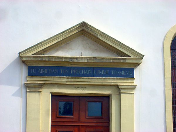 Unter der französischen Inschrift über der Eingangspforte „Liebe Deinen Nächsten wie Dich selbst“ steht die Jahreszahl „5594“ (= 1833/34). Am Giebel über dem Eingang sind die beiden Gesetzestafeln angebracht.