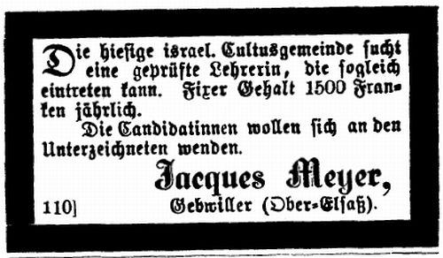 Eine eher seltene Stellenanzeige einer jüdischen Gemeinde erschien im Januar 1878, als man in Gebweiler eine „Lehrerin“ (!) suchte: