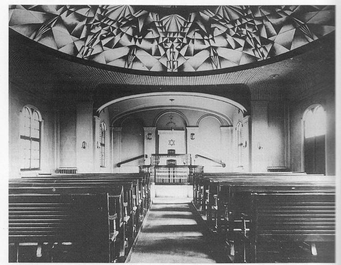 Bauskizze u. Zeichnung der Synagoge (von Hermann Peters) und Innenraum (hist. Aufn.)