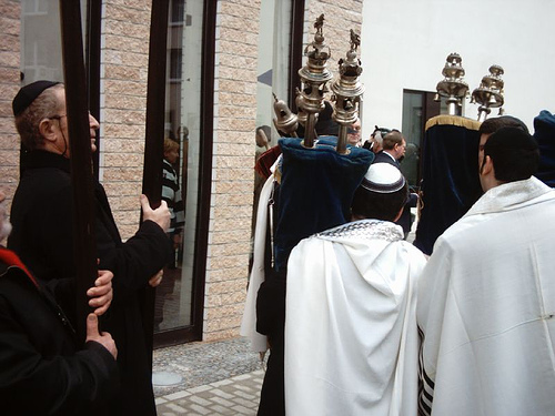 neue Synagoge (Aufn. D. Ullrich, 2007, aus: wikipedia.org, CC BY-SA 3.0) und Einbringen der Thora-Rollen (Aufn. Chajm Guski, 2007)
