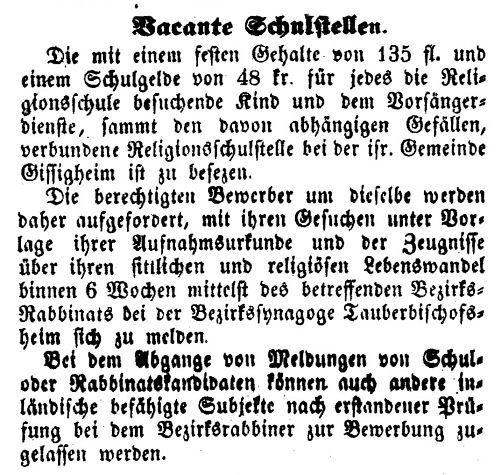 Eppingen, 24. Dezember. Die Gesetze über die bürgerliche Gleichstellung der Juden und die Freizügigkeit sind in Deutschland neuzeitliche Errungenschaften, für welche wir den leitenden hohen Regierungen und Volksvertretungen, die unser Recht anerkannten, zu stetem Dank verpflichtet sind. Doch stehen auch den dadurch erzielten Vorteilen ... auch nur wenige Schattenseiten gegenüber. Zu diesen gehören unstreitig auch in der vorderen Reihe die bedauernswerte Wahrnehmung von der Auflösung so vieler großen und mittelgroßen israelitischen Landgemeinden. So lese ich heute mit Wehmuth, daß die israelitische Gemeinde Gissigheim, Amts Tauberbischofsheim, (mit nur noch einer Witwe und einer ledigen Person), durch allerhöchsten Erlaß aufgelöst wurde. Als Einsender dieses im Jahre 1860 unmittelbar nach der Entlassung aus dem Schullehrerseminar den Dienst als Lehrer, Cantor und Schochet übernahm, wohnten 33 israelitische Familien in Gissigheim, die bekanntlich alle gute Jehudim waren. Es wurde da viel gelernt und zähle ich zwanzig Lehrer, von dieser Gemeinde entstammend, welche in allen Theilen Deutschlands ihre Thätigkeit entfalteten. Außer den übrigen Chawerot, von denen sich Niemand ausschloß, wurde während meines dortigen Aufenthalts auch ein Chai Adam Verein gegründet, welchem sich die meisten Baalei Habajit anschlossen und den Zweck hatte, an den Abenden, namentlich aber am Schabbat nachmittags mehrere Stunden Vorträge aus diesem sefär zu hören, welche von dem seligen Kaufmann Maier Strauß er ruhe in Frieden und dem Einsender dieses Artikels abwechslungsweise gehalten werden. Auch der "Israelit", der Mai 1860 erstmals herausgegeben wurde, und auf welchen ich dem Wunsche meines vorgesetzten Herrn Bezirksrabbiners Löwenstein in Tauberbischofsheim (Mehora"r ["Unser Lehrer, unser Rabbiner Rabbi] Jaakow Löwenstein - er ruhe in Frieden) abonnirte, bildete eine angenehme Lektüre im Verein. Da die Gemeinde Gissigheim als solche nun zu Grabe getragen ist, erachte ich es für meine Pflicht, mit Gefühlen der Wehmuth ihr diesen kurzen Nachruf zu widmen." E.E.