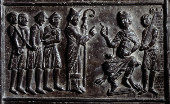 Bischof Adalbert und jüdische Kaufleute vor der kgl. Obrigkeit (Bronzerelief am Eingang des Gnesener Doms, um 1180)
