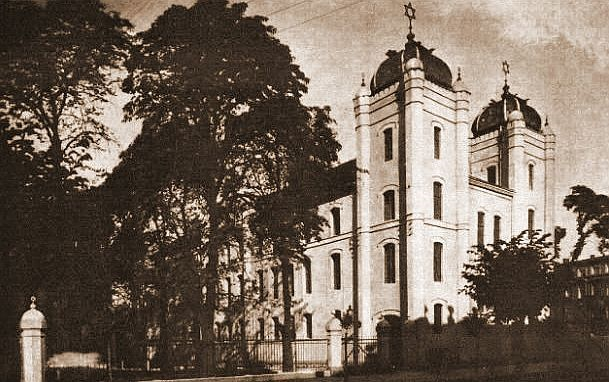 Hornstraße mit Synagoge links im Bild (hist. Karte, um 1900) Gnesener Synagoge (hist. Aufn., um 1920, aus: wikipedia.org, CCO)