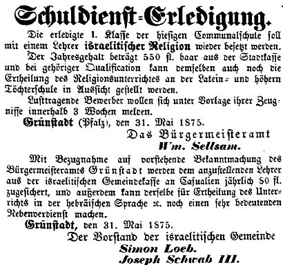 Anzeige in der "Allgemeinen Zeitung des Judentums" vom 8.6.1875