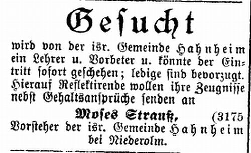 Stellenangebote der jüdischen Gemeinde Hahnheim, in: "Der Israelit" vom 26.Sept. 1886 und vom 17.Juni 1889