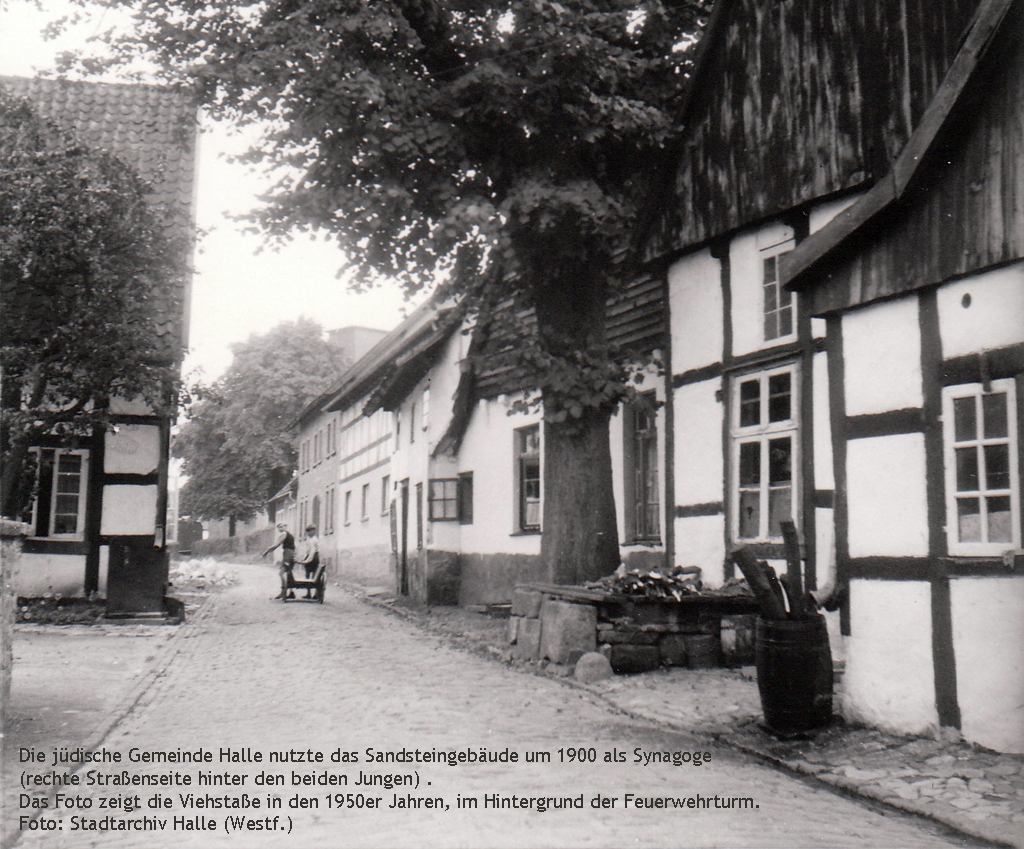 Die jüdischen Familien Halles lebten fast ausschließlich an der Langen Straße. Nach 1860/1870 verlor die jüdische Gemeinde zunehmend Mitglieder; mit der Abwanderung der meisten Familien in die Großstadt Bielefeld war die Haller Gemeinde bald nicht mehr lebensfähig. 1903 wurde die Synagoge geschlossen, da kein Minjan mehr zustande kam. Das ehemalige Synagogengebäude wurde Anfang der 1980er Jahre wegen Baufälligkeit abgerissen.