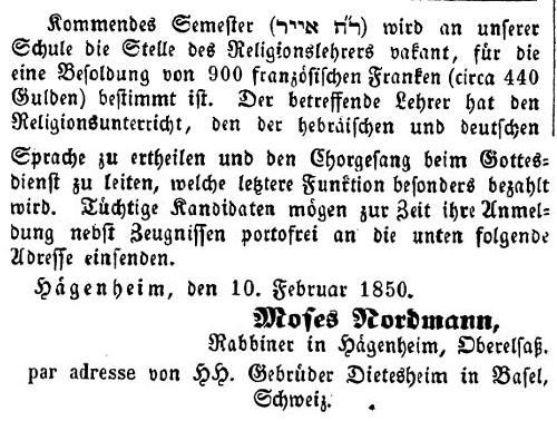 Moses Nordmann wurde 1809 als Sohn eines jüdischen Viehhändlers in Hegenheim geboren. Nach seinem Studium in Heidelberg und Würzburg übernahm er das Rabbinat in Hegenheim; seit Mitte der 1830er Jahre war er - neben seiner Tätigkeit in seinem Oberelsässer Rabbinatsbezirk - auch für die in die Nordschweiz eingewanderten jüdischen Familien zuständig. Zeit seines Lebens kämpfte er – in Wort und Tat - für die Gleichstellung der Juden in der Schweiz. Gleichzeitig setzte er sich für eine Modernisierung des orthodox-jüdischen Gottesdienstes ein. Moses Nordmann verstarb 1884 an seiner Wirkungsstätte in Hegenheim.