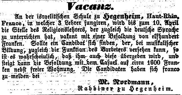 Über die jüdische Gemeinde Hegenheim berichtet S. Mannheimer, der damalige Lehrer der Gemeinde, u.a. wie folgt:„ ... Die hiesige israelitische Gemeinde, aus ca. 160 Familien bestehend, macht beinahe die Hälfte der Einwohner des Ortes aus. ... Handel, Gewerbe und Ackerbau bilden ihre Beschäftigung. ... Die Synagoge wurde im Laufe des Sommers prachtvoll renoviert ... Der Herr Grand-Rabbin Klein von Colmar und der hiesige Rabbiner Nordmann hielten am Freitag Abend die Einweihungsreden, worin sie den Zweck des Gotteshauses in eindringlicher Sprache dartaten. ... Die hiesige israelitische Schule, vor ungefähr 30 Jahren gegründet, steht unter der Aufsicht des Herrn Rabbiners. Es werden in derselben das Französische, Deutsche und Hebräische von drei Lehrern unterrichtet. Man sieht den wohltätigen Einfluß, den die konfessionelle Trennung hat, da dadurch die Kenntnis der Religion weit mehr gefördert wird, als an den Orten, wo die Kinder die christliche Elementarschule besuchen ... Obgleich in den Schulen des Elsasses das Französische Unterrichtssprache ist, so ist doch die deutsche Sprache vorherrschend ... Die elsässischen Rabbiner sind daher genötigt, abwechselnd in beiden Sprachen zu predigen. ... Was auf mich ... einen angenehmen, erfreulichen Eindruck macht, ist die Einigkeit und das gute Einvernehmen, die hier herrschen und die auch bei der Restauration der Synagoge ... nicht gestört worden sind. Möchten sie auch in der Folge ungetrübt erhalten bleiben ! ...“ (aus: „Allgemeine Zeitung des Judentums“ vom 18.10.1858)