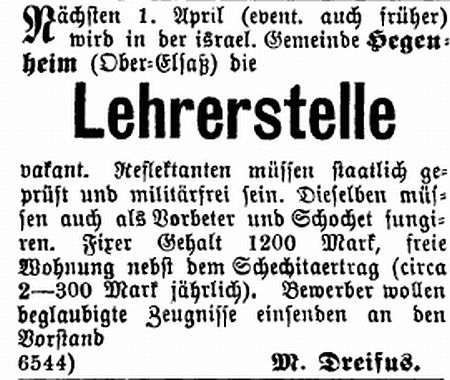 Aus einem Artikel „Der Israelit“ vom 28.Febr. 1901: „ Hegenheim (Elsass), 26. Februar. Daß viele unserer jüdischen Landgemeinden fortgesetzt abnehmen, ist eine bekannte Tatsache, die auch durch die Geschichte der hiesigen Gemeinde bestätigt wird. Unsere Gemeinde zählte am Anfang des (19.)Jahrhunderts ca. 200 Familien, … Im Jahre 1848 wurde die Auswanderung mehrerer Familien durch eine Judenverfolgung veranlasst. Die Wegziehenden wandten sich nach Frankreich, da die Schweiz, die ihnen wohl näher gelegen hätte, den Juden bis 1860 verschlossen war. … Erst durch den im Jahre 1860 abgeschlossenen Handelsvertrag zwischen Frankreich und der Schweiz fielen auch hier die Schranken der Intoleranz. Demzufolge verliehen zahlreiche Familien unseren Ort und siedelten nach Basel über, wo sie vorher schon zum großen Teil ihr Gewerbe betrieben hatten. Der Ausgang des deutsch-französischen Krieges endlich entführte uns nochmals eine Reihe jüdischer Gemeindemitglieder, die nur auf französischem Boden glücklich zu werden glaubten. ...“