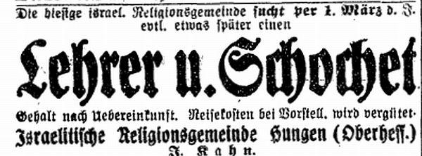 Angaben aus: Friedrich Prokosch, Die Israelitische Gemeinde in Hungen, in: F.Prokosch, Chronik unserer Stadt , S. 80