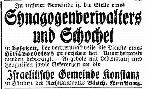 Ab Ende der 1890er Jahre wurde in Konstanz ein Ortsrabbinat eingerichtet; seit 1925 war die Stadt Sitz eines Bezirksrabbinats.
