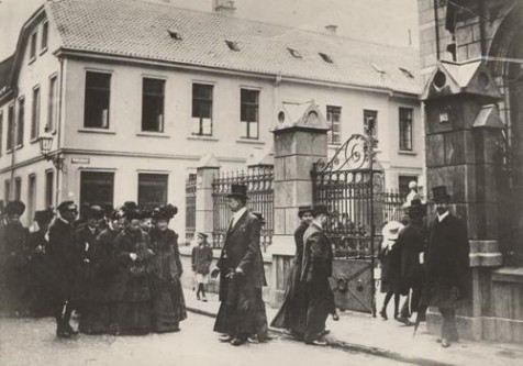Krefelder Synagoge (hist. Aufn. 1902) und Juden auf dem Weg zur Synagoge (1910)