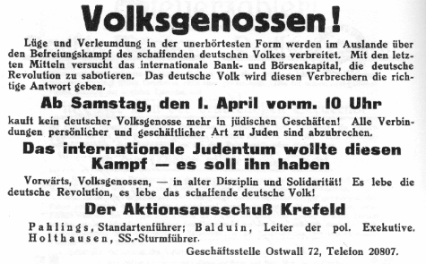 Der Boykott jüdischer Geschäfte in Krefeld schien aber keine große Wirkung gezeigt zu haben, wie die folgende Anzeige im „Krefelder Generalanzeiger” vom 11.4.1933 bewies: