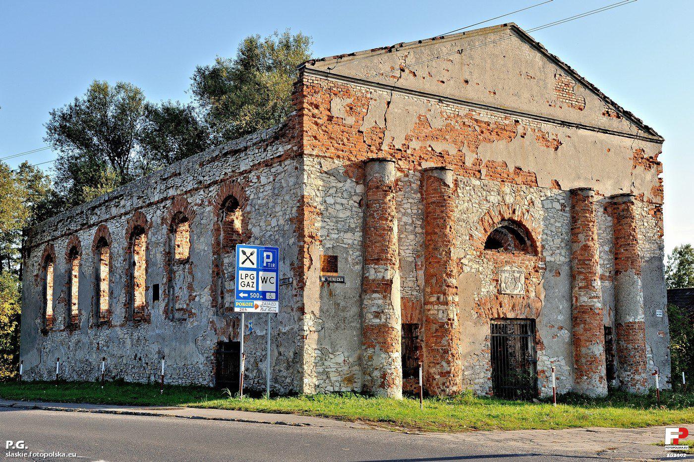 Ehem. Synagoge in Praschkau (links Aufn. aus: opolskie.regiopedia.pl, um 1960; rechts Aufn. aus: miastapolski.blox.pl , 2007)
