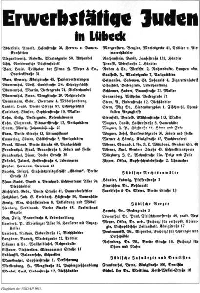 „... Der Monat stand im Zeichen der Aufklärung der breitesten Öffentlichkeit über die Juden. Der Kampf gegen diese wurde auf breitester Basis vorgetragen. Er erweckte ein lebhaftes Echo in der Öffentlichkeit. Spontan sammelten sich Teile der Bevölkerung meistens in den Abendstunden vor den jüdischen Geschäften, um hierdurch ihr ablehnendes Verhalten den Juden gegenüber zum Ausdruck zu bringen ... Die Einfahrtsstraßen sind durch Hinweise wie ‘Juden sind hier unerwünscht’ oder ‘Lübeck will Euch nicht’ oder ‘Wer vom Juden frisst, stirbt daran’ usw. gezeichnet. Das Ostseebad Travemünde konnte, nachdem der Abwehrkampf gesteigert war, innerhalb von 14 Tagen von Juden völlig befreit werden.”