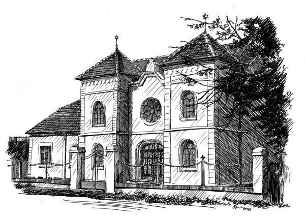 Synagoge in Mährisch-Budwitz (hist. Aufn., aus: zanikleobce.cz) und Zeichnung (Miroslav Vomácka, 2006)