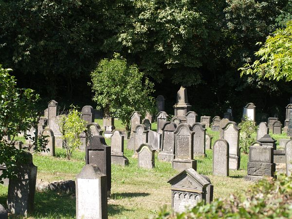 Auch auf dem jüdischen Friedhof in der Waldstraße, der ca. 200 erhaltene Grabsteine zählt, ist eine Gedenktafel angebracht. Der ältere jüdische Begräbnisplatz wurde 1944 durch Kriegseinwirkung zerstört; dessen ca. 30 verbliebene Grabsteine – der älteste datiert von 1640 - wurden auf den neuen Friedhof verbracht.