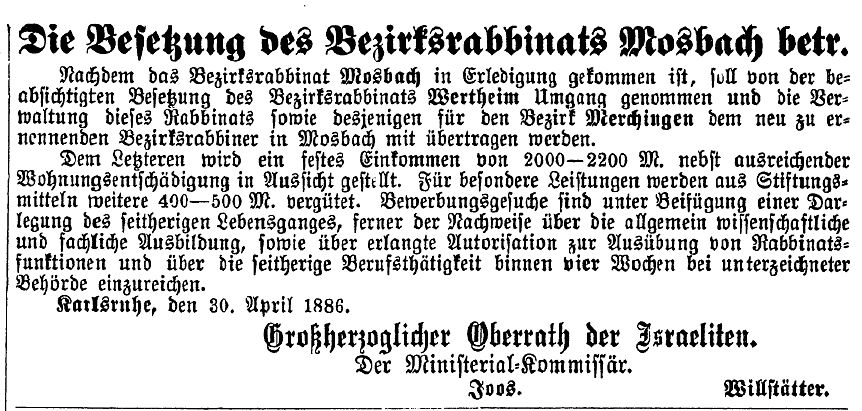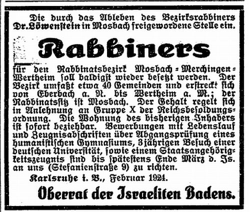 Seit 1827 war Mosbach Sitz eines Bezirksrabbinats, dem die israelitischen Gemeinden Billigheim, Binau, Eberbach, Großeicholzheim, Neckarzimmern, Neudenau, Stein a. Kocher, Strümpelbrunn und Zwingenberg unterstellt waren.
