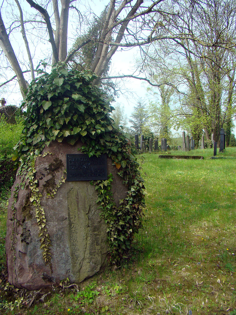 Auf dem jüdischen Friedhof am Kapellenweg (Aufn. Peter Schmelzle, 2012, aus: wikipedia.org, CC BY SA 3.0) - hier befinden sich noch ca. 70 originale Grabsteine - erinnert ebenfalls ein Gedenkstein an die jüdischen NS-Opfer des Ortes. Nahe des Eingangs findet man die Grabstätte des Bezirksrabbiners Leopold Löwenstein (geb. 1843 in Gailingen), der im Alter von 80 Jahren in Mosbach verstarb.