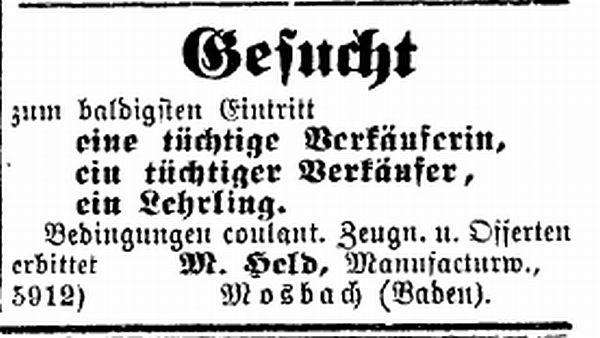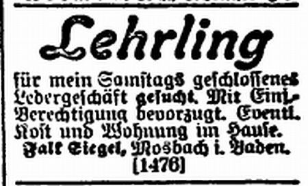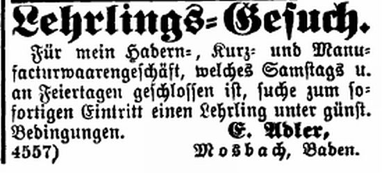 Lehrstellenangebote jüdischer Geschäftsleute in Mosbach (Anzeigen aus der Zeit von 1890 bis 1905):