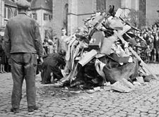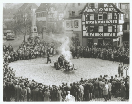 Der „Scheiterhaufen“ mit dem brennenden Synagogeninventar auf dem Marktplatz (Aufn. Stadtarchiv)