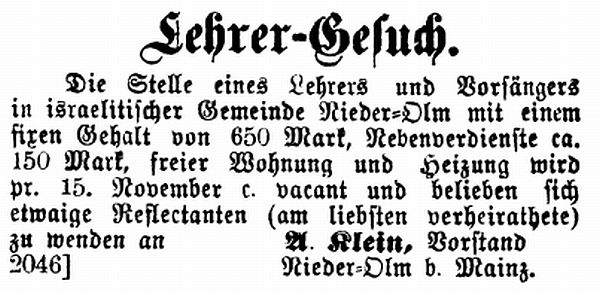 Erst 1855 konstituierten sich die Juden Nieder-Olms zu einer eigenen kleinen Religionsgemeinde; zuvor zählten die hiesigen jüdischen Familien zur israelitischen Gemeinde von Hahnheim.