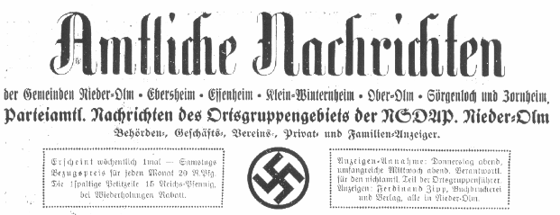 Judenfrechheiten. Trotzdem die Tageszeitungen jüdische Ausschreitungen wie Schiebungen, Skandalaffären, Betrügereien, Paßfälschungen und dergl. in Hülle und Fülle aus dem Ausland melden, scheint sich die Judenschaft im Inlande immer noch nicht der gebotenen Zurückhaltung befleißigen zu wollen, wie auch in letzter Zeit mal wieder ein Vorfall in Nieder-Olm bewies. Ein hiesiger jüdischer Viehhändler belästigte einen Landwirt mit zudringlichen Schacherangeboten und erfuhr bei dieser Gelegenheit, daß der Landwirt seine Viehgeschäfte bei einem christlichen Viehhändler getätigt hatte. Anstatt nun bescheiden von dannen zu ziehen, wagte es der Hebräer dem Landwirt in unverschämter Weise Vorhaltungen zu machen, ... Kaum war es dem Bauern möglich, sich der anmaßenden Aufdringlichkeit des Juden in seiner eigenen Behausung zu erwehren. Wir raten dem Zudringling, für die Folge deutsche Landwirte ... unbehelligt zu lassen ...