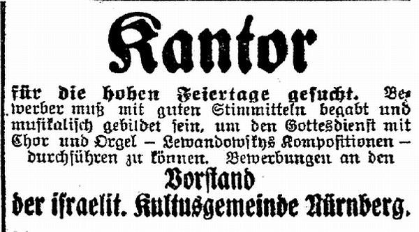 "Nürnberg, 5. Sept. Heute Abend, um 5 1/2 Uhr, fand die feierliche Synagogen-Einweihung des Vereins 'Adaß Jißroel – Isr. Religionsgesellschaft - (a.V.) hierselbst statt. In der Vorhalle des prachtvollen Baues versammelten sich die Mitglieder der Vorstandschaft und des Bau-Ausschusses, sowie die Ehrengäste. Herr Architekt Ochsenmayer überreichte mit einer Ansprache den Schlüssel dem ersten Vorsitzenden, Herrn Don Sichel, welcher in wohlgeformter, sehr beifällig aufgenommener Rede erwiederte. Hieran reihten sich die Reden der Herren Vorstandsmitglieder Grünbaum und Meyer, die ebenfalls von Begeisterung getragen waren. In tiefgefühlten Worten pries Herr Grünbaum des Allgütigen Fügung, während Herr Meyer dem Bau-Ausschuss namens des Vereins dankte und hervorhob, daß die 'Bauarbeit' mit dem heutigen Tage keine abgeschlossene sein dürfe, sondern daß wir weiter sorgen müssen, den Glanz der herrlichen Heimstätte, zur Ehre des Ewigen errichtet, durch die Förderung der Thora zu erhalten. Nun begann der Festakt in der Synagoge, … Um 8 Uhr Abends war die erhebende Feier beendet, die für alle Beteiligten unvergeßlich bleiben wird."