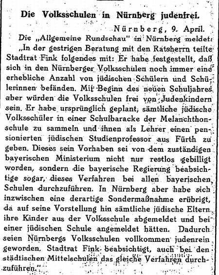 ... In den gestrigen Vormittagsstunden wurde der Abbruch der Nürnberger Synagoge auf dem Hans-Sachs-Platz im Rahmen einer Kundgebung des nationalsozialistischen Nürnbergs begonnen. Im Mittelpunkt der Veranstaltung stand eine grundlegende und richtungsweisende Ansprache Julius Streichers. Die begonnenen Arbeiten werden bis zum Beginn des kommenden Reichsparteitages bereits vollendet sein. Das Recht zu dieser notwendigen Säuberung des ehrwürdigen Nürnberger Altstadtbildes gab das Gesetz, das Nürnberg in die Reihe der deutschen Städte einordnet, deren Ausbau und Wiederherstellung im Namen des Reiches geschieht. ...