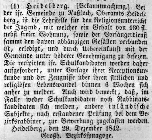 Die kleine Synagogengemeinde Nußloch war seit 1827 dem Rabbinatsbezirk Heidelberg zugeordnet.