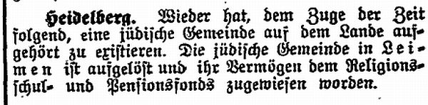 Im zunächst pfälzischen, ab 1803 badischen Leimen bei Heidelberg gab es bis 1905 eine jüdische Gemeinde; sie hatte sich um 1700 gebildet. Ihre Blütezeit besaß die Leimener Gemeinde mit ca. 80 Personen gegen Ende des 18. Jahrhunderts; im Laufe des 19.jahrhunderts erreichte ihre Zahl kaum 30 Köpfe. Wohngebiet der Leimener Juden war die heutige Herrengasse. Die Gemeinde unterhielt eine Synagoge am Marktplatz. Mit der Abwanderung ins aufstrebende Mannheim ging die Zahl der Gemeindeangehörigen stetig zurück; die wenigen verbliebenen schlossen sich der Nusslocher Gemeinde an.